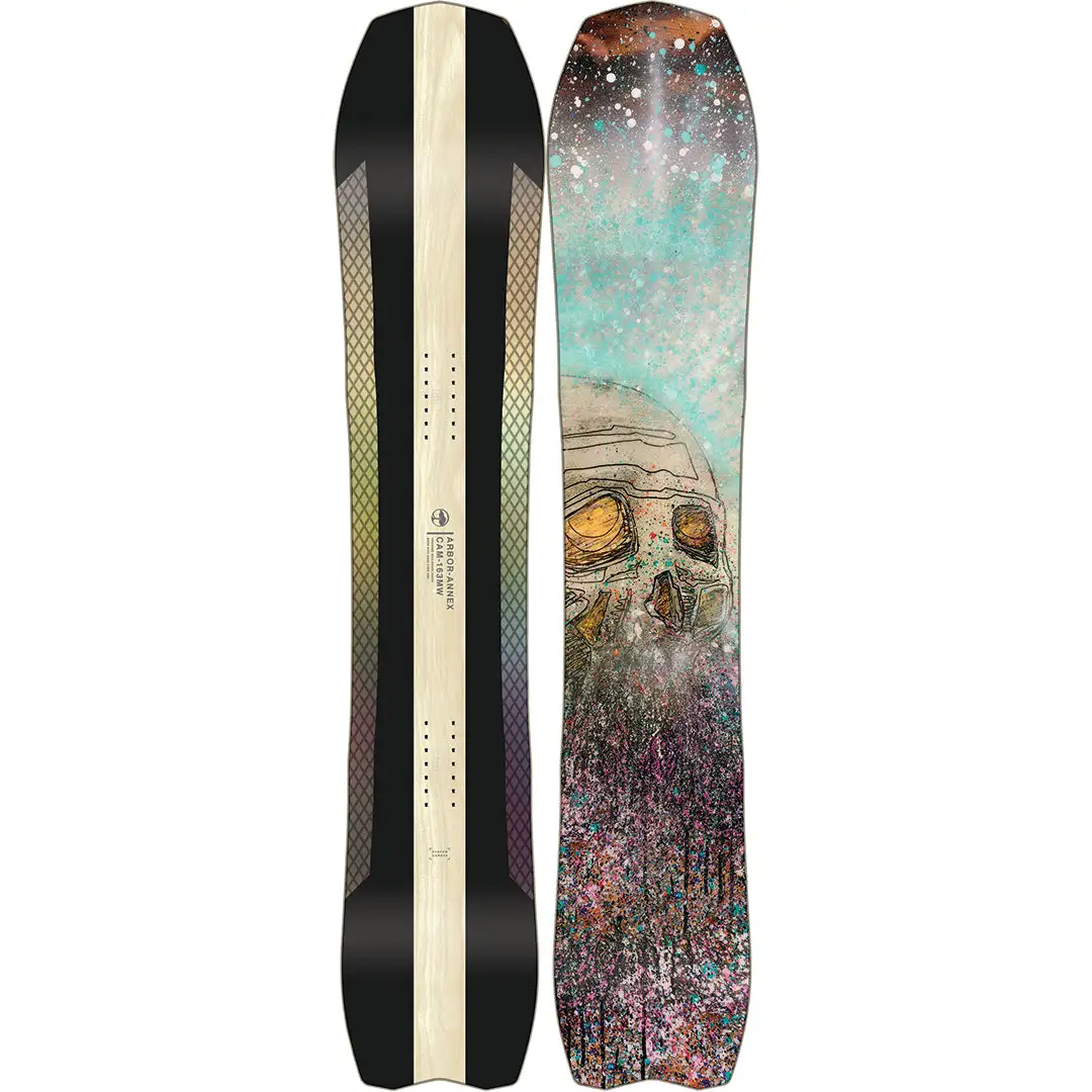 The Arbor Annex is the newest and most technical board in their line, that is Bryan Iguchi’s creation and an evolution of his Iguchi Pro Camber board. Focused on riding big mountain lines, the Annex has a longer nose, 2cm of taper and a stub tail. With those three features you get a ride that floats easily through powder, has strong edge hold and a tail that can handle big drops and deep slashes.