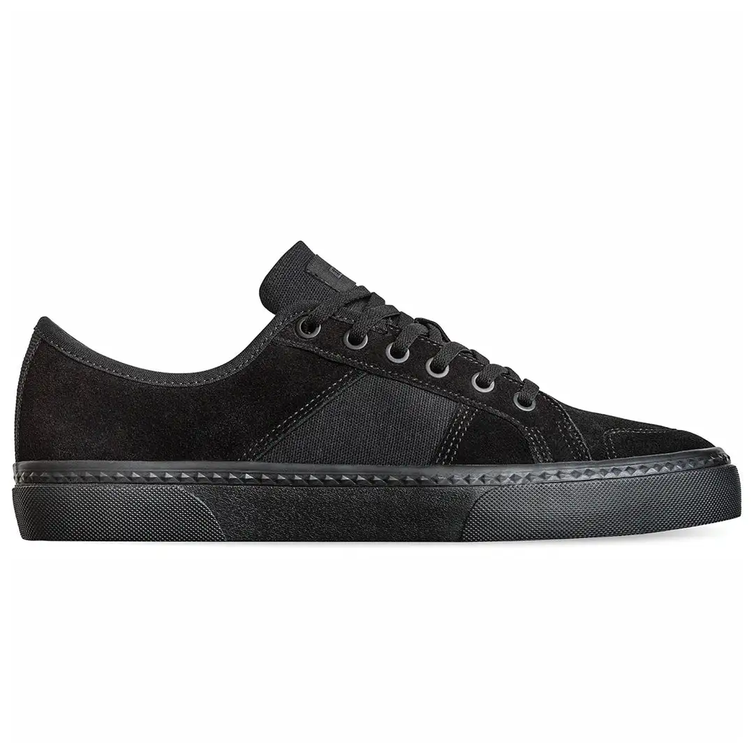 The Surplus in Black/Black is a vulcanized skate style featuring Globe’s Shockbedâ„¢ insole for enhanced comfort and a reinforced rubber toe for protection. Also features minimal tongue and collar padding and flattened vamp for a sleek, low silhouette. Made from shaved suede/canvas.